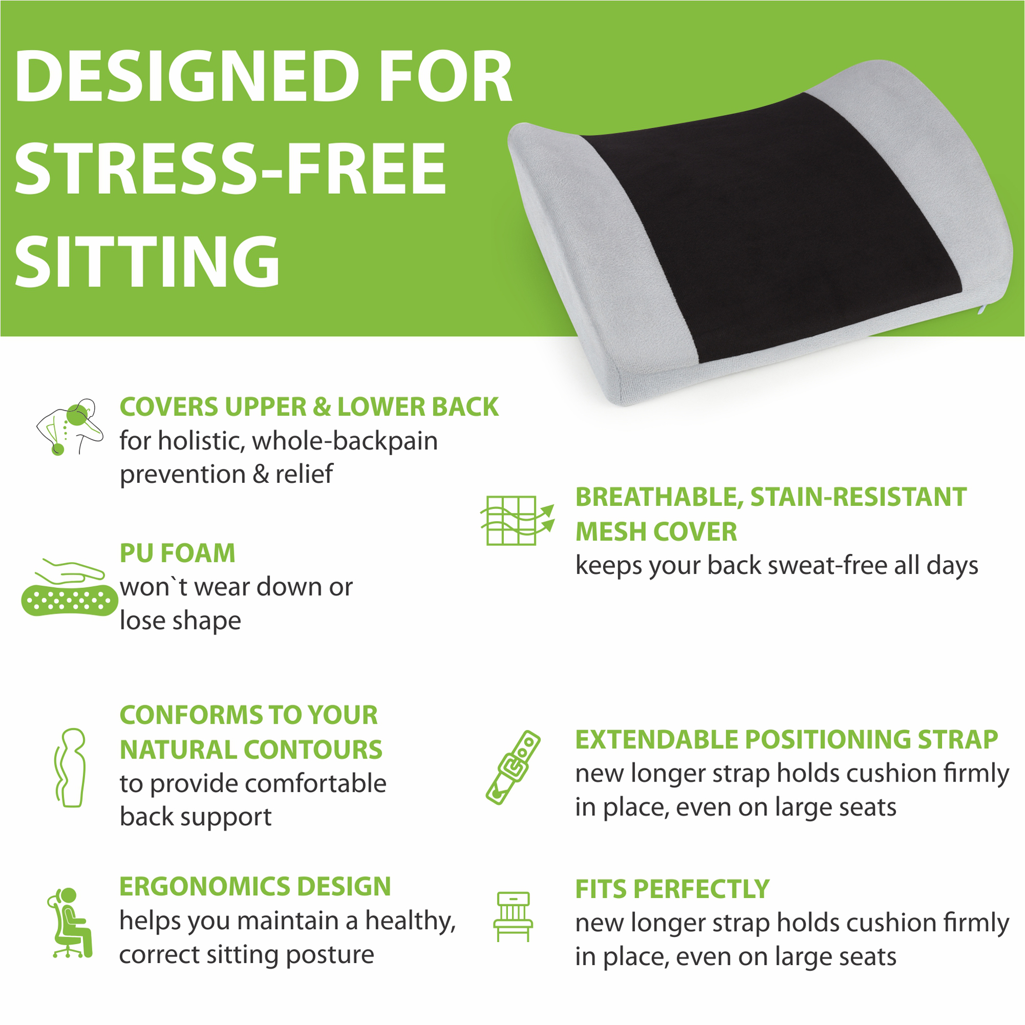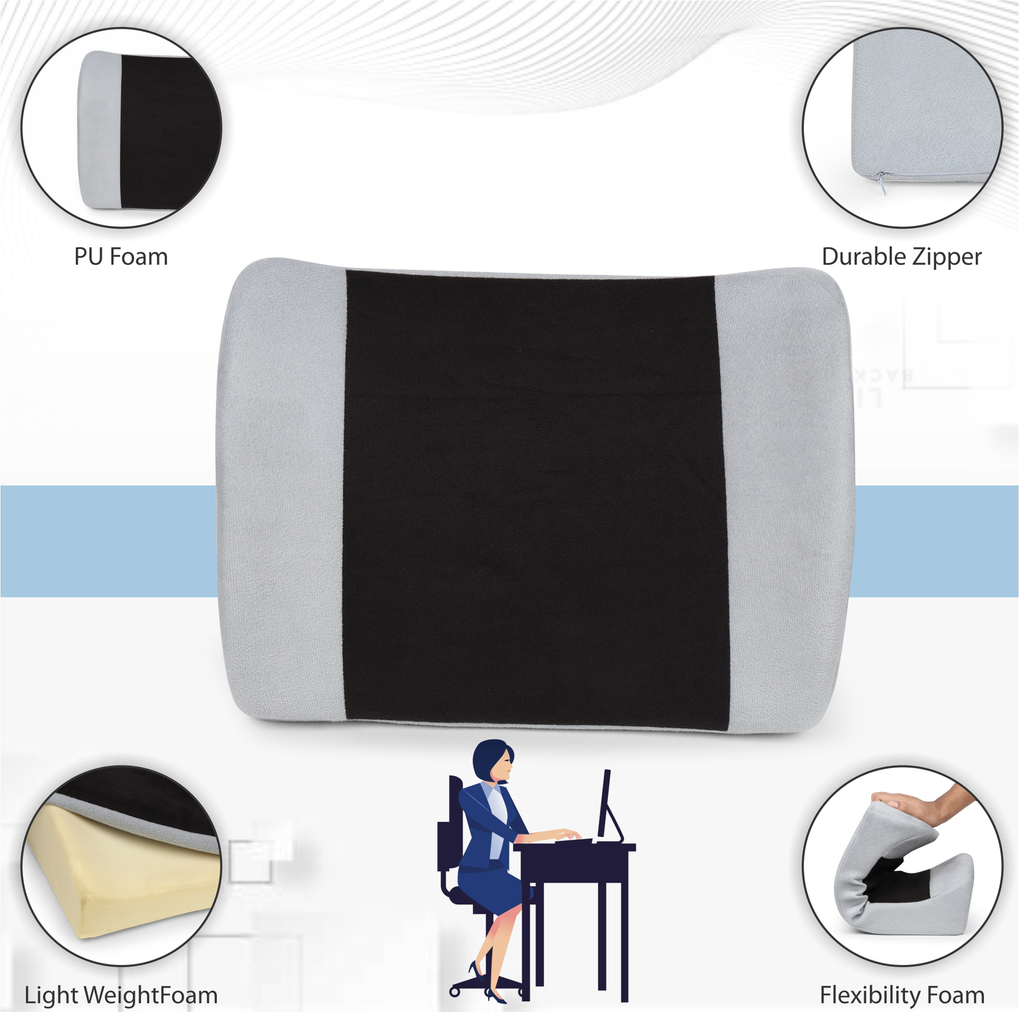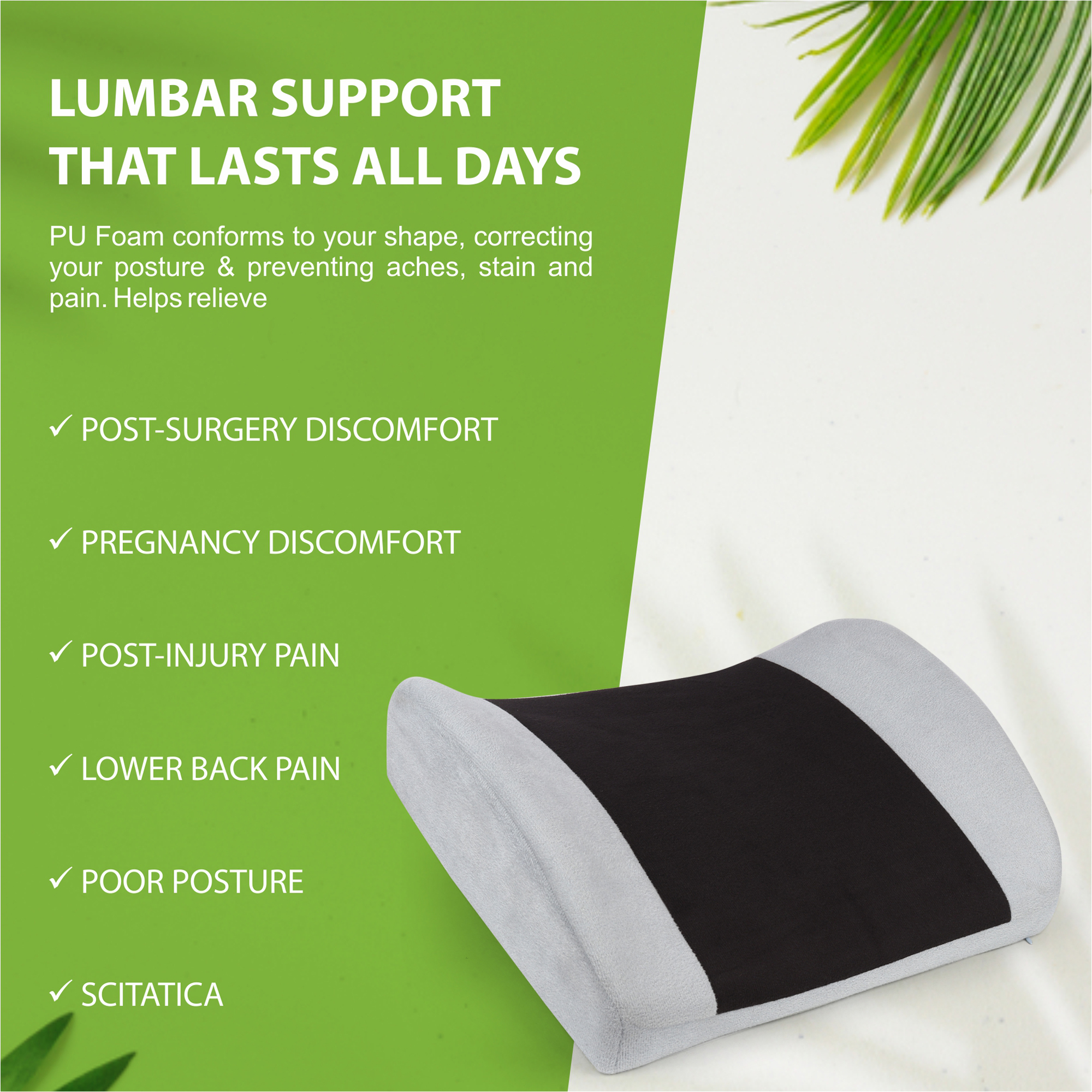 Crafted from high-density Polyurethane Foam, our lumbar support cushion offers quick and lasting relief from back pain. It ensures ergonomic comfort and durable lower back support throughout the day.