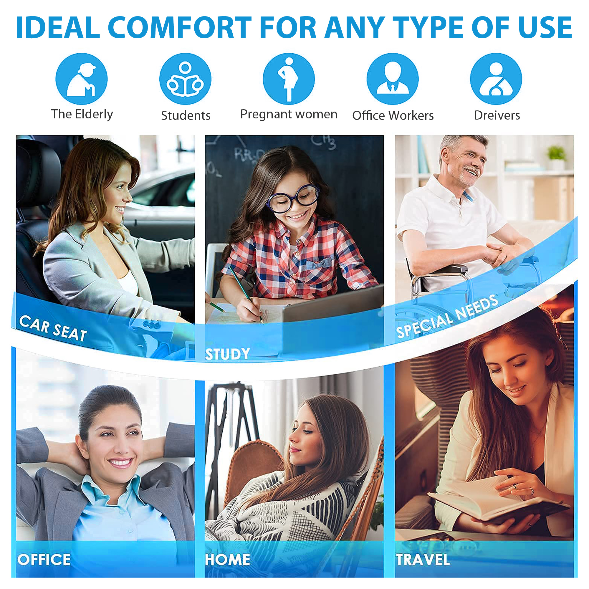 • ONE CUSHION FOR MULTIPLE USAGE :- Orthopedic Cushion pillow supports the recovery of spinal problems such as lower back problems, Posture correction, Spine Alignment, disc herniation, coccyx injury, sciatica. Universal Size – fits all types of chairs, Car seats, great for office or Work area, home desk chairs, gaming chairs, mobility scooter, automotive seat, wheelchairs. It also suitable for travel, sporting events or pregnancy.